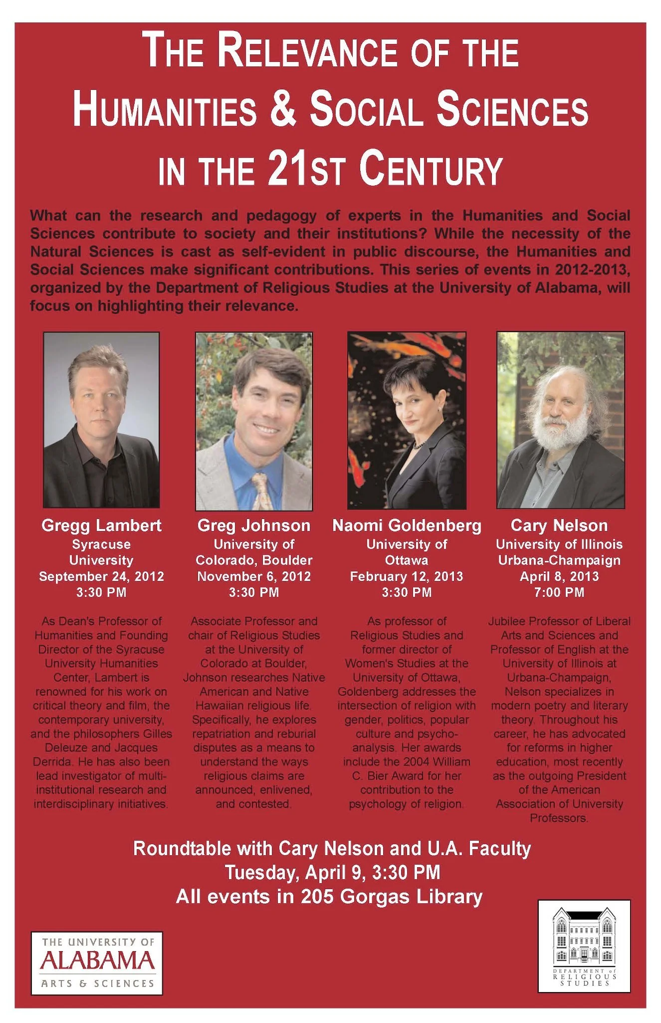 In the 2012-13 academic year, the Dept. of Religious Studies hosted a lecture series centering around a common theme: the relevance of the humanities in the modern university. Below is an excerpt from the flier advertising the lecture series: